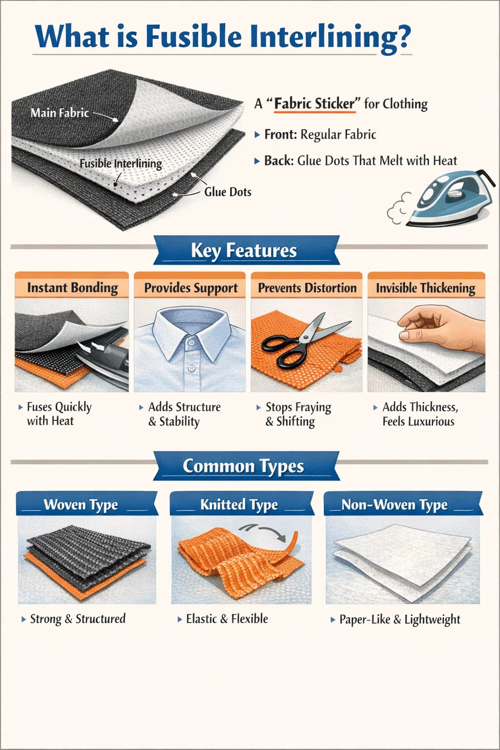 Instant Bonding: Dette er dens største funksjon. Du legger den ganske enkelt på baksiden av hovedstoffet og stryker den med et strykejern eller en varmepresse. Varmen smelter limprikkene på baksiden, noe som får mellomfôret og plaggstoffet til å binde seg tett sammen.