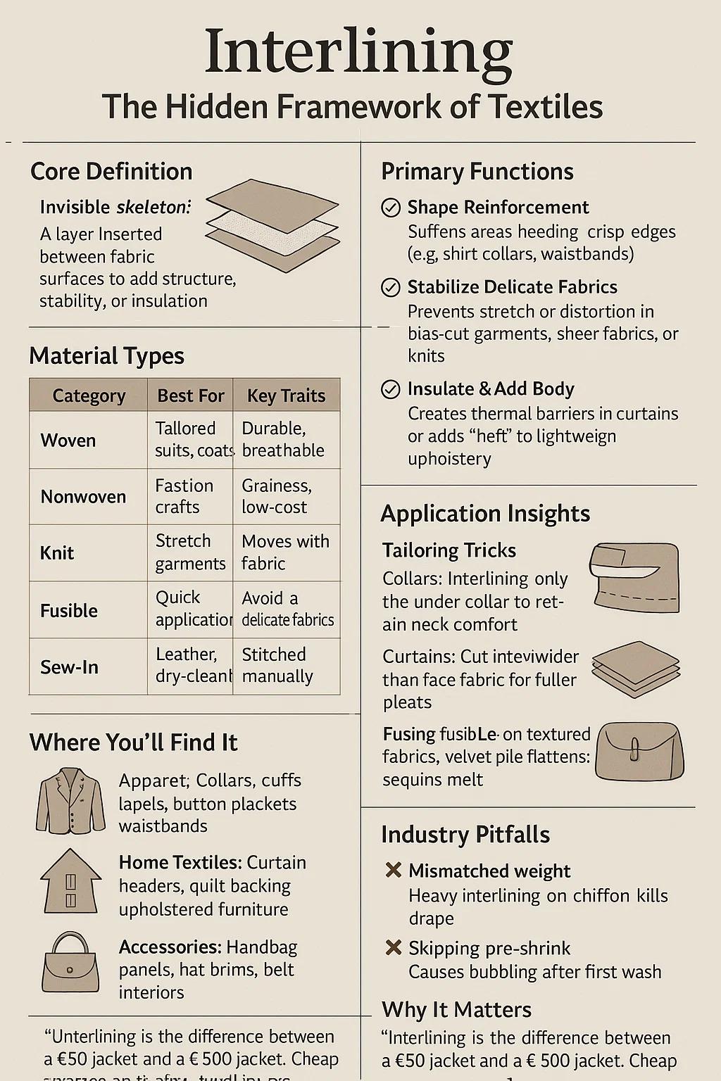 "Interlining er forskjellen mellom en € 50 jakke og en € 500 jakke. Billige versjoner sprekker etter renseri; luksustyper overlever det ytre stoffet." - skreddersydd skredder, Milan