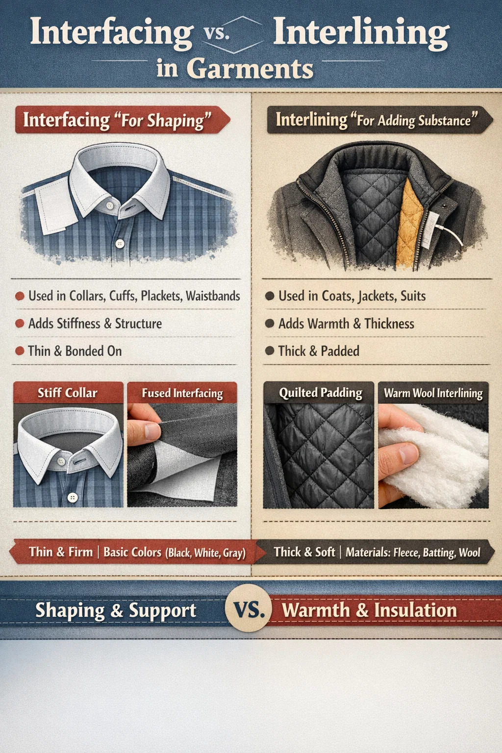 I plaggproduksjon og stoffbehandling, interlining og grensesnitt er som det "usynlige skjelettet" og det "isolerende laget" av klær. Selv om begge er gjemt inne i plagget, tjener de helt forskjellige formål.